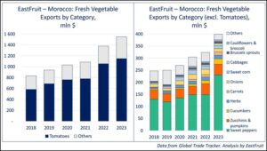 Tout au long de 2023, le Maroc a connu une forte augmentation de ses revenus d’exportation dans le secteur des légumes frais, même si le volume physique des exportations a diminué. L’analyse de «EastFruit » révèle que les exportations de légumes ont rapporté au pays près de 1,6 milliard de dollars, soit une augmentation de 12 % par rapport à l’année précédente et un chiffre de près de 50 % supérieur à la moyenne des cinq dernières années.